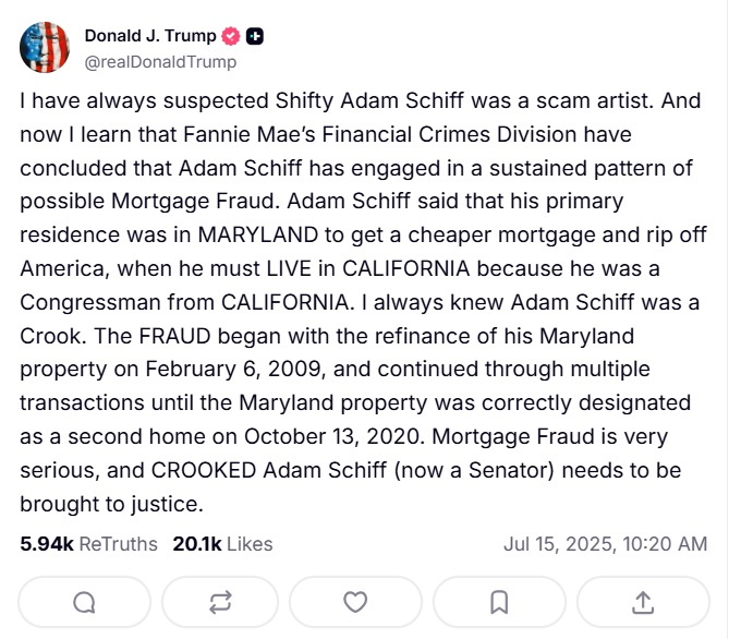Tags: Adam Schiff frauddeep state hypocrisyDemocrats legal corruptionDOJ criminal referralLetitia James mortgage scandalLetitia James under investigationmortgage fraud chargesSchiff DOJ investigationSchiff primary residence scamTrump Schiff response