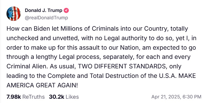 How can Biden let Millions of Criminals into our Country, totally unchecked and unvetted, with no Legal authority to do so, yet I, in order to make up for this assault to our Nation, am expected to go through a lengthy Legal process, separately, for each and every Criminal Alien. As usual, TWO DIFFERENT STANDARDS, only leading to the Complete and Total Destruction of the U.S.A. MAKE AMERICA GREAT AGAIN!