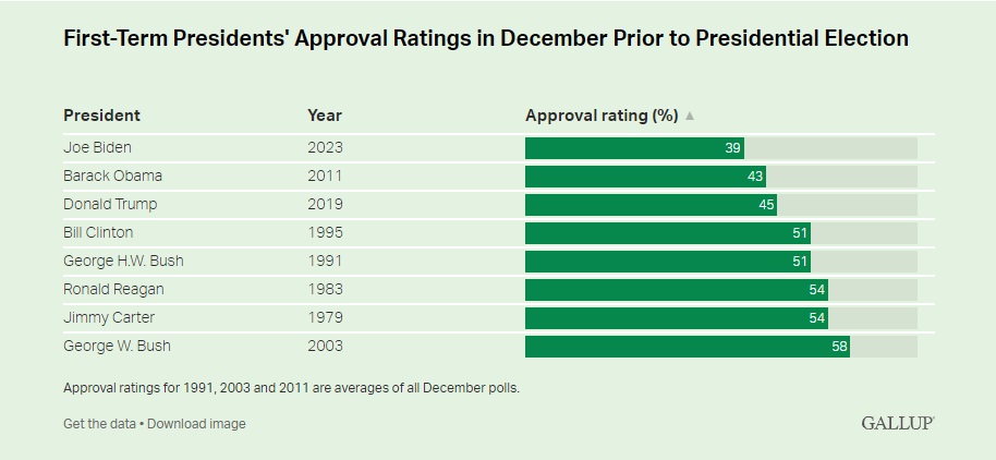 When comparing the approval ratings of the previous seven presidents at the same stage in their first term, Biden’s current 39% is the lowest. Barack Obama (43%) and Donald Trump (45%) had somewhat higher ratings going into the year they ran for reelection, but everyone else was above 50%.