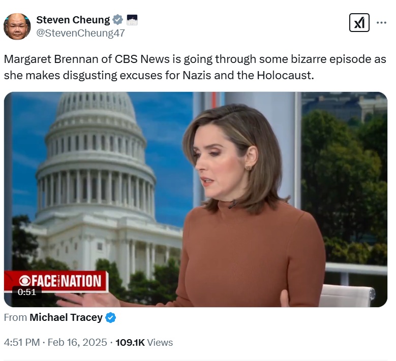 “Margaret Brennan of CBS News is going through some bizarre episode as she makes disgusting excuses for Nazis and the Holocaust.”