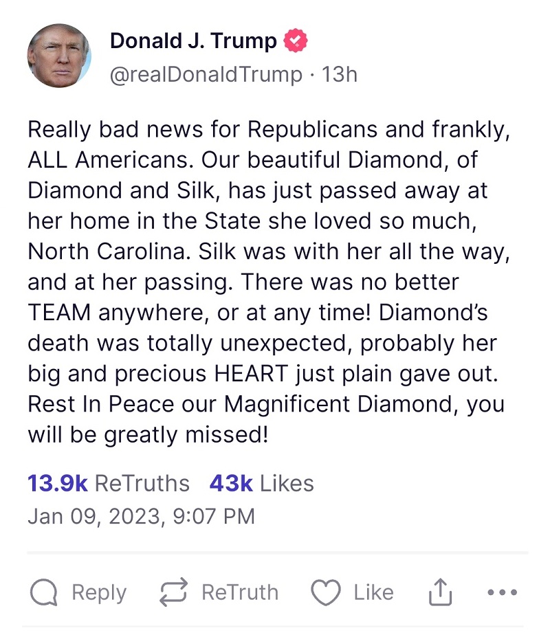 “Really bad news for Republicans and frankly, ALL Americans. Our beautiful Diamond, of Diamond and Silk, has just passed away at her home in the State she loved so much, North Carolina. Silk was with her all the way, and at her passing. There was no better TEAM anywhere, or at any time! Diamond’s death was totally unexpected, probably her big and precious HEART just plain gave out. Rest In Peace our Magnificent Diamond, you will be greatly missed!”