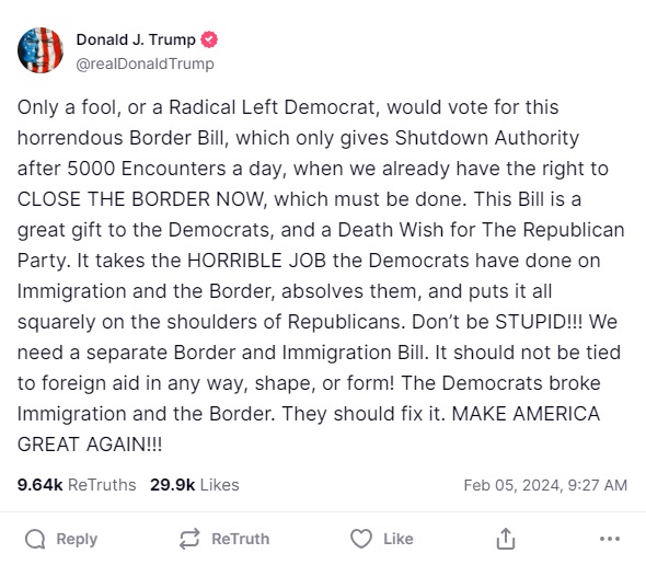 He went on to say, “It takes the HORRIBLE JOB the Democrats have done on Immigration and the Border, absolves them, and puts it all squarely on the shoulders of Republicans. Don’t be STUPID!!! We need a separate Border and Immigration Bill. It should not be tied to foreign aid in any way, shape, or form! The Democrats broke Immigration and the Border. They should fix it. MAKE AMERICA GREAT AGAIN!!!”