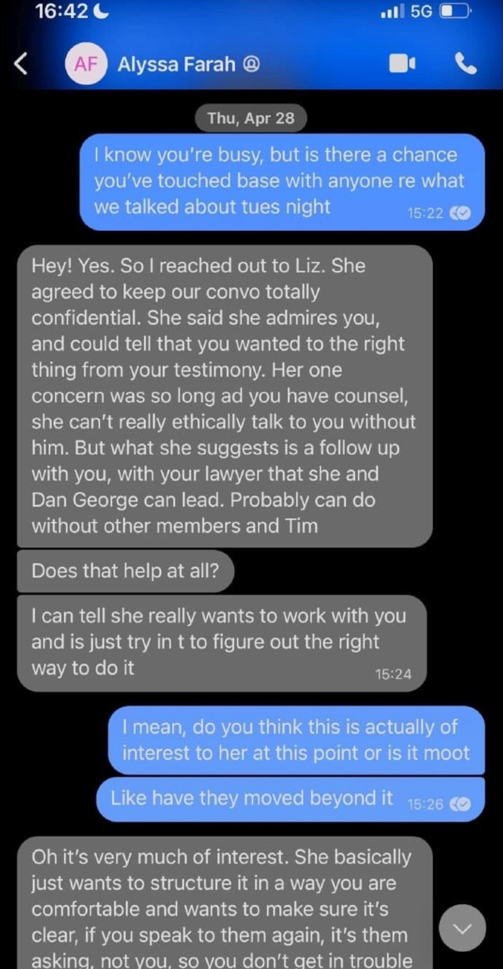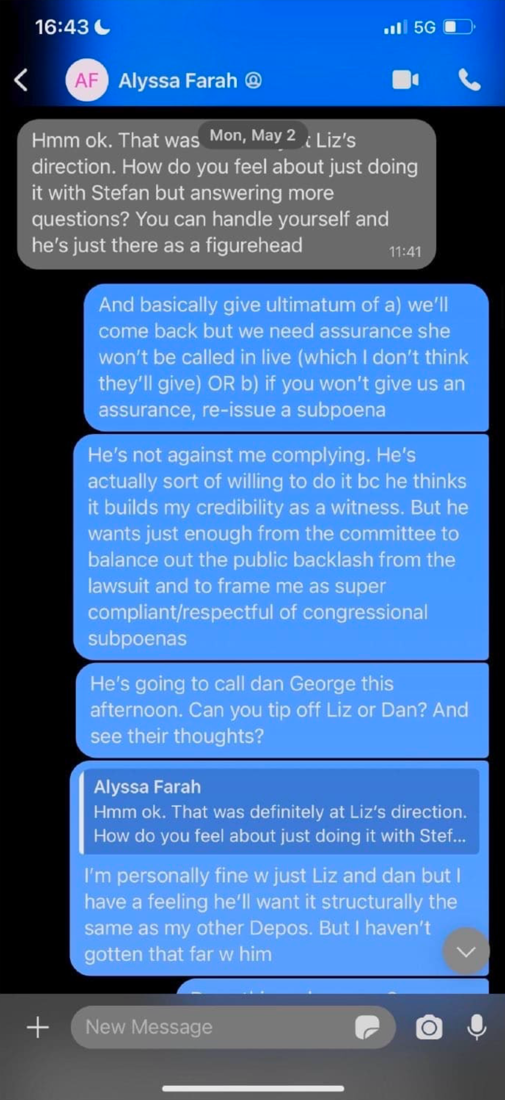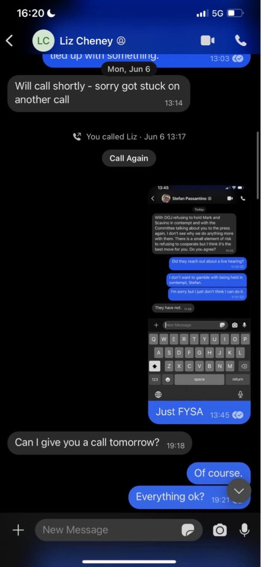 According to text messages, that appear to be from the encrypted messaging app “Signal,” between Hutchinson and Farah Griffin obtained by the Subcommittee, Cheney agreed to communicate with Hutchinson through Farah Griffin.However, it appears that Cheney knew communicating with Hutchinson while Hutchinson was represented by an attorney and a subject of the Select Committee’s investigation, without going through Hutchinson’s attorney, would be unethical. This is evident by Farah Griffin’s text to Hutchinson that Cheney’s “one concern was so long as [sic] you have counsel, she can’t really ethically talk to you without him.”?