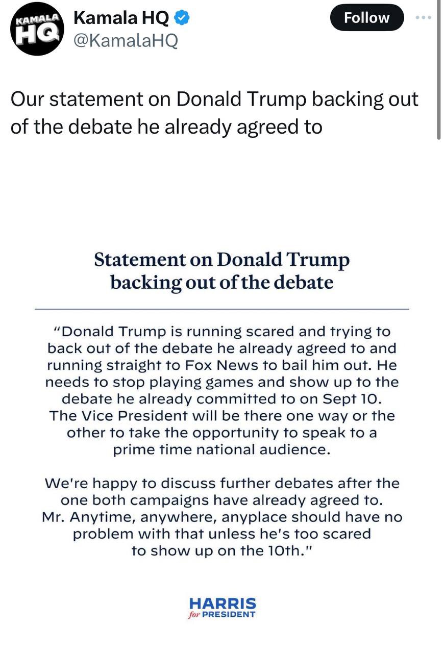 “I have agreed with FoxNews to debate Kamala Harris on Wednesday, September 4th. The Debate was previously scheduled against Sleepy Joe Biden on ABC, but has been terminated in that Biden will no longer be a participant, and I am in litigation against ABC Network and George Slopadopoulos, thereby creating a conflict of interest. The FoxNews Debate will be held in the Great Commonwealth of Pennsylvania, at a site in an area to be determined. The Moderators of the Debate will be Bret Baier and Martha MacCallum, and the Rules will be similar to the Rules of my Debate with Sleepy Joe, who has been treated horribly by his Party – BUT WITH A FULL ARENA AUDIENCE!….”