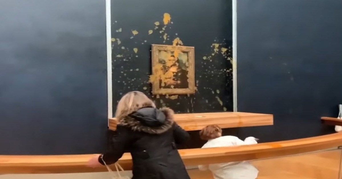 “Two activists from the environmental movement, ‘Riposte Alimentaire’ sprayed pumpkin soup on the armored glass protecting the Mona Lisa, this Sunday, January 28, 2024, around 10 a.m. (4 a.m. ET), “according to a statement released by the Louvre Museum.” The Louvre’s security staff immediately intervened.