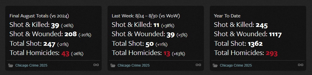 It shows 39 fatal shootings in August, with 208 shot and wounded, for a total of 247 people shot. Thanks to the ingenuity of the street people there, total homicides hit 43. Can you imagine living in a city with 43 murders in one month? No, it’s all Trump’s fault, right?