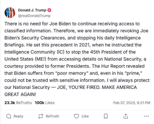 Trump made the announcement on Truth Social (because where else would he drop a bombshell like this?), reminding everyone that it was Biden who started this game back in 2021 when he blocked Trump from receiving national security briefings.