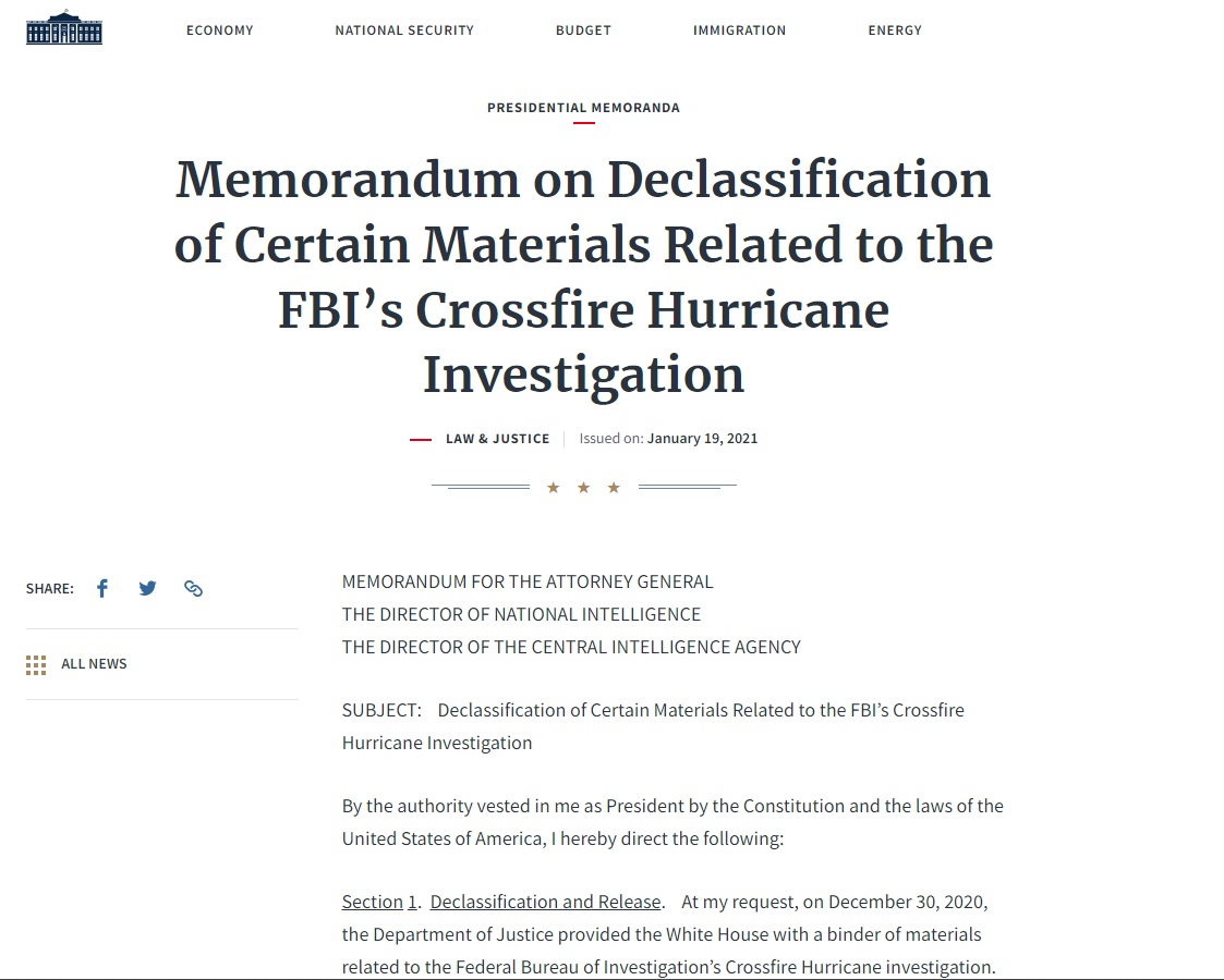 We know that he declassified the documents that Joe Biden’s personal KGB force, the FBI, went after when they raided his Mar-a-Lago home because Trump issued a Presidential Memorandum on January 19, 2021, the day before he left office, which means he was still president. The memorandum declared that President Trump declassified all the documents that had to do with Operation Crossfire Hurricane. They were the evidence against the FBI and DOJ for the lawlessness they perpetrated on Trump during and after the 2016 election with the made-up accusation of Russian collusion.